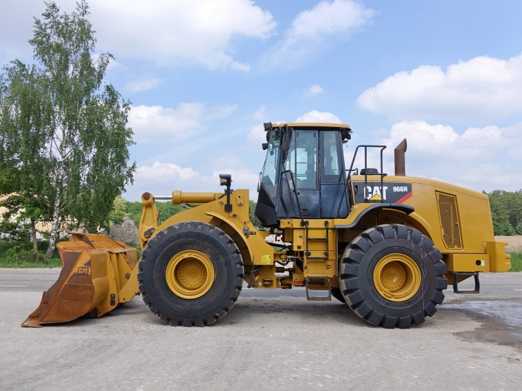 The Caterpillar 966H wheel loader features a Cat C11 ACERT turbocharged diesel engine producing 262 net horsepower, an operating weight of approximately 52,254 pounds, and a bucket capacity ranging from 3.4 to 5.5 cubic yards. Key specifications include a transport length of about 30 feet, a top speed of 23.2 mph, and a standard bucket width of around 10 feet 7 inches.